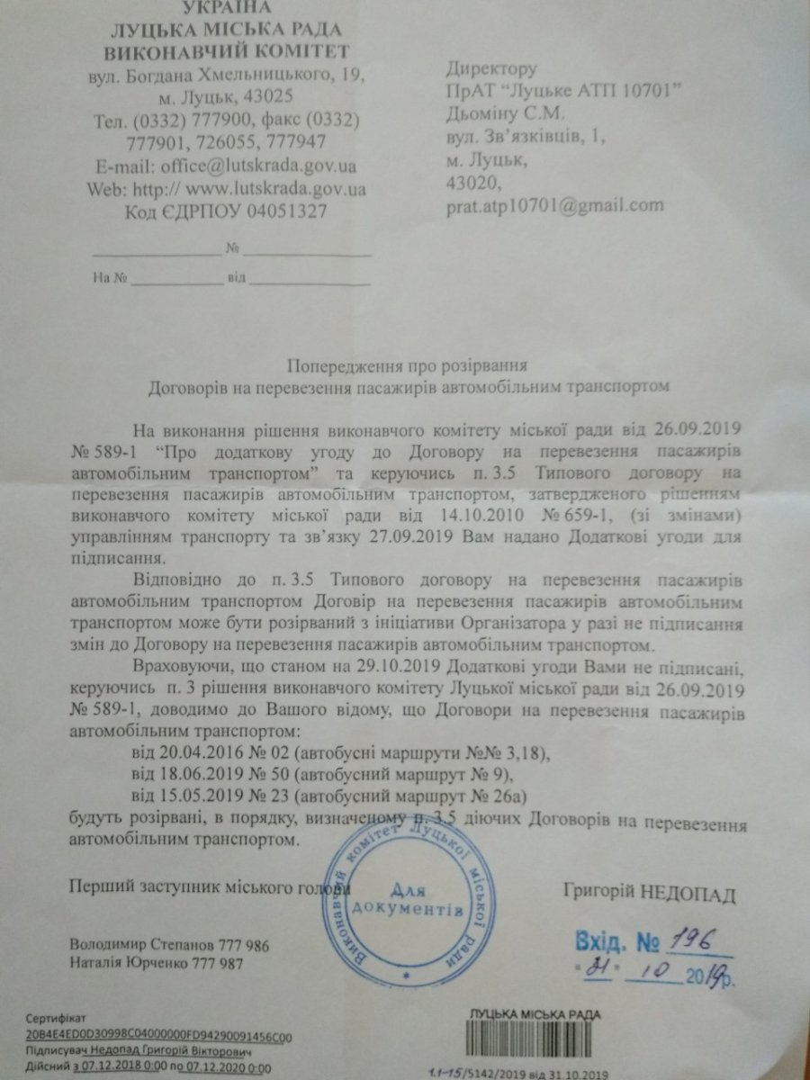 Нам, зрештою, таки вдалось дістати копію такої додаткової угоди, яка збунтувала власників транспортних підприємств, які обслуговують більшість маршрутів Луцька.