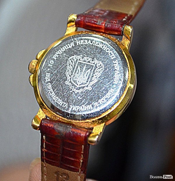 Є ще один годинник з позолотою. Це годинник від українського бренду KLEYNOD. На ньому зображений герб України. Цей подарунок на свято Миколая Дячук зробив собі теж в часи роботи у «Луцьктеплі». Назбирав грошей і купив, каже він. Вартує близько п’яти тисяч гривень.