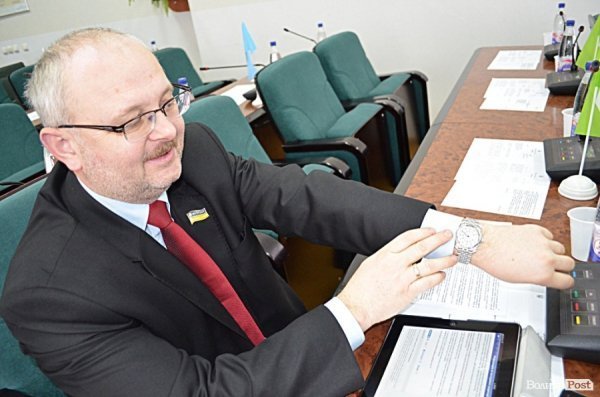 А цей депутат-бізнесмен про свій годинник розповідати не дуже хотів, переконуючи, що забув вдома. Хоча на руці красувався недешевий, як розповідають його колеги, аксесуар.