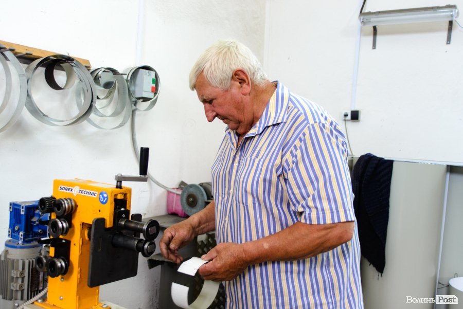 «Отут і працюю», – проводить Євген Петрович до прохолодного просторого приміщення. – «Зараз от робимо відра на пожежні щити для своїх об’єктів. От такі кріплення для ринв теж», – бере один за одним до рук свої вироби. У компетенції Євгена Петровича – виготовлення вентиляційних елементів (колін, переходів, труб), витяжних шахт, деталей для водостічних систем із оцинкованого листа/нержавійки, виготовлення віконних відливів тощо.