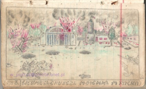 Малюнок із зображенням бомбардування луцького аеродрому 10 вересня 1939. Фото з сайту польського сержанта Євгена Каспжакова