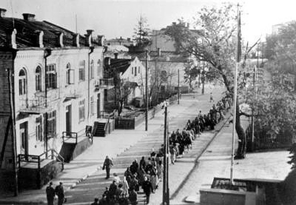 Теперішня вулиця Богдана Хмельницького. Праворуч знизу - сходи до нинішньої міської ради. Будинок з трикутним дахом - театр. Фото 1942 року з єврейського архіву Яд Вашем