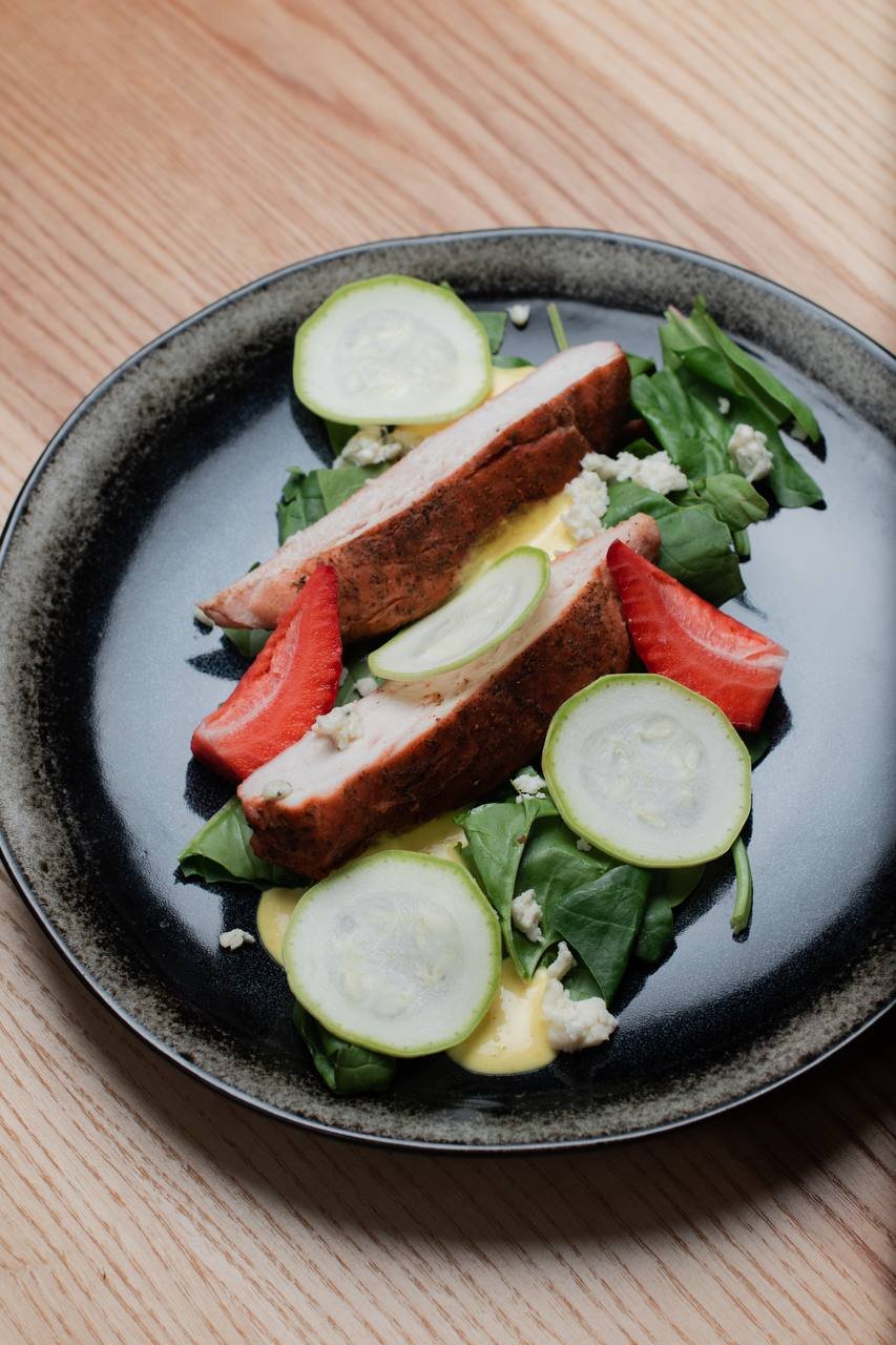 Замовляємо куряче філе з полуницею, зеленню та соусом теріякі і холодну каву. Поки готують їжу, розпитуємо бренд-шефа про кухню ресторації загалом.