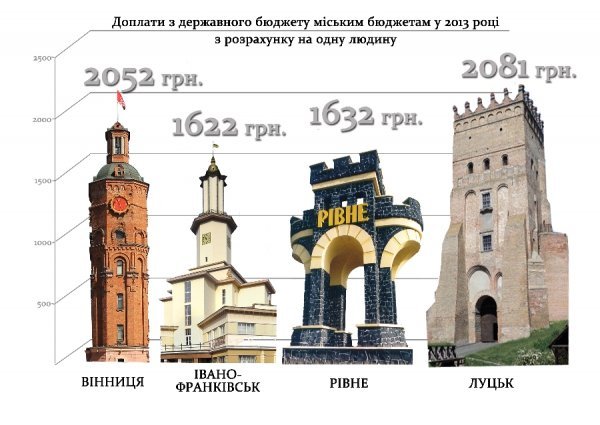 Івано-Франківську держава виділяє 354 млн грн. (1622 грн. на людину), Рівному – 406 млн грн. (1632 грн. на людину), значно більше Вінниці – 732 млн грн. (2052 грн. на людину). На такому тлі Луцьк зі своїми 2081 грн. на людину виглядає рекордсменом. Здавалося б, кому потрібні рекорди в отриманні допомоги? Проте, з іншого боку, в окремо взятому місті, та ще й з врахуванням того, що велика частина податків лучан іде відразу у державний бюджет – це не так і погано. Та й щедра дотація є непоганою альтернативою скорочення видатків.