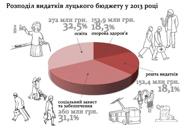 Понад 80% усіх видатків луцького бюджету спрямували на освіту (272 млн грн., 32,5%), охорону здоров’я (152,9 млн грн., 18,3%) та соціальну сферу (260 млн грн., 31,1%).