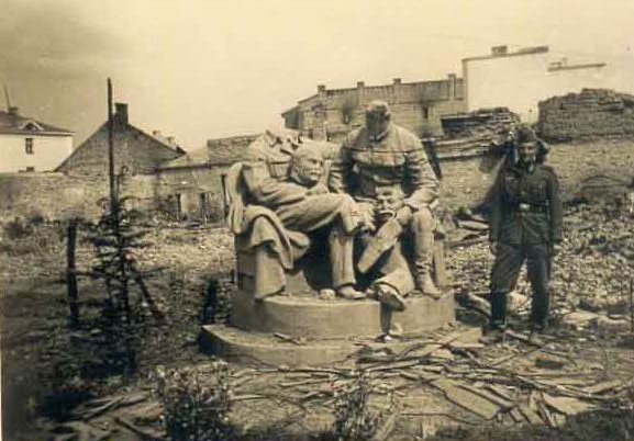Ця скульптура була встановлена у сквері на місці нинішнього ЦУМу. Коли в 1941 році німці захопили Луцьк, вони цей пам’ятник зруйнували. Леніну відбили ногу, а обом постатям збили голови і посадили їх на руки. Біля такої композиції фотографувалися німецькі солдати.