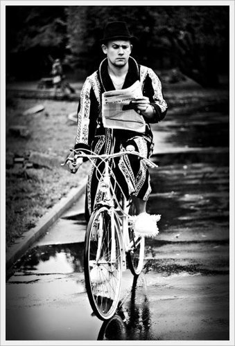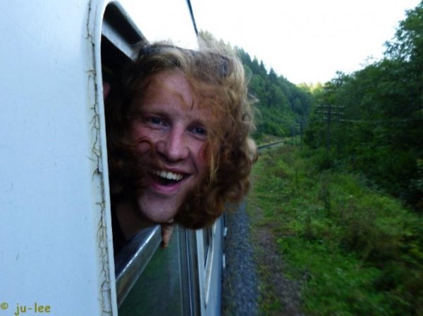 Не знаю. Все нудно зазвичай у поїздах :) Втикаєш у вікно, «Мурка» не грає, смердить шкарпетками, перегаром. А ще туалет ‒ це дуже таке місце… Карочє, майже, як в літаку, але ще й із запахом. І качає там, качає, розумієш? Аж хочеться так і сісти там, подумати про життя, напитися водиці, чистої як сльоза, з крана. А, і ще люблю голову висунути з вікна, і язик ‒ і щоб як у кабріолеті. Але це якщо годен будеш те вікно відкрити :)