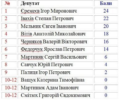 За сумарними показниками (табл. 2) найбільш успішно зі своїми виборцями працюють Ігор Єремеєв, Степан Івахів та Євген Мельник. Аутсайдерами є депутати, які найбільш успішно працюють у парламенті – К. Ващук, А.Мартинюк та Г.Смітюх.