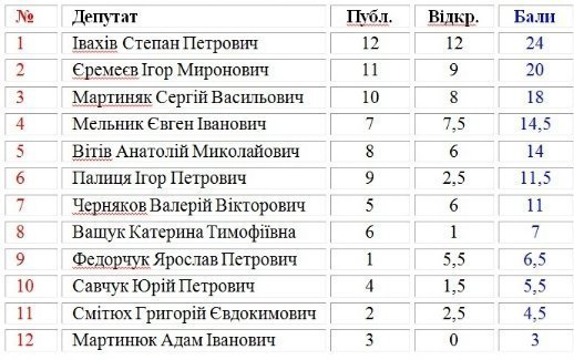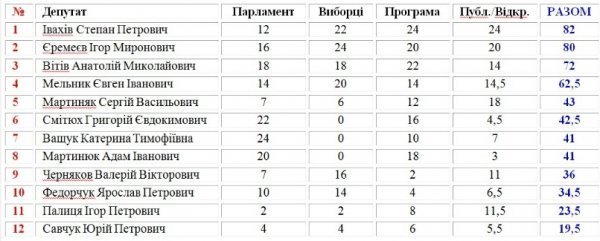 Якщо підсумувати показники, що мають відношення до парламентської діяльності депутатів (таблиця 1.) то серед лідерів народні депутати, які вже декілька скликань працюють у стінах Верховної Ради – Катерина Ващук, Григорій Смітюх та Адам Мартинюк.