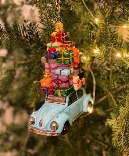 Прихильникам ретромобілів сподобається блакитна машинка, на даху якої містяться новорічні подарунки. Саме така іграшка красномовно нагадає про свято і водночас гарно доповнить ялинку.
