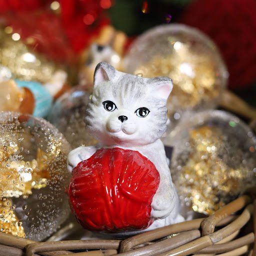 Любителі тварин звернуть увагу на прикрасу, виконану у вигляді симпатичного білого кошеняти. Тваринка тримає лапками червоний клубок із нитками. Іграшка додасть оригінальні ноти в декорування святкового деревця.