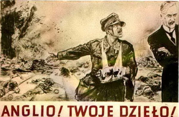 Польський плакат часів війни. Напис: «Англія! Це твоя справа!» (Польський солдат звинувачує прем’єра Великобританії Невіла Чемберлена у нерозумні політиці «умиротворення», що привела до світової війни і поразки Польщі