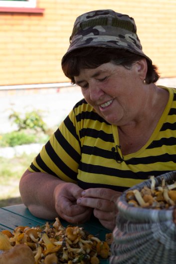Марія Пантонік чистить гриби, які приніс із лісу її чоловік. "Так ми живемо кожен день. Ну не кожен день, а як нам принесуть роботу, ми отак і працюємо. Бачите, яка цікава робота, головне — заспокоює нерви, — жартує жінка. — Таку красу переберемо, а ще супчику зваримо".