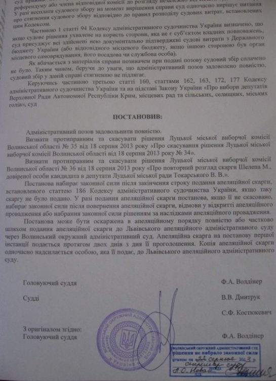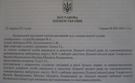 20 серпня я подав у Волинський окружний адміністративний суд позовну заяву про визнання протиправними та скасування рішень Луцької міської виборчої комісії Волинської області від 18 серпня 2013 року №35 «Про скасування рішення Луцької міської виборчої комісії від 18 серпня 2013 року №34» та №36 «Про повторний розгляд скарги Шелепа М., довіреної особи кандидата в депутати Луцької міської ради Токарського В.В.»