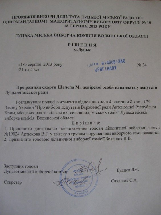 Таким чином, в силі залишилось рішення Луцької міської виборчої комісії №34, яким було встановлено факт грубого порушення виборчого законодавства зі сторони голови ДВК №19024 Артюхова Віктора Григоровича та достроково припинено його повноваження голови комісії.