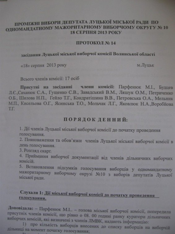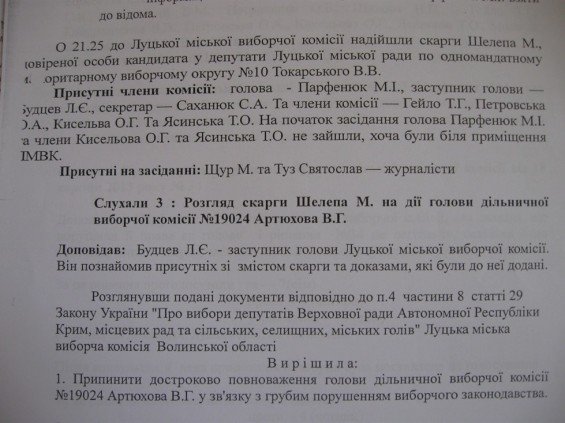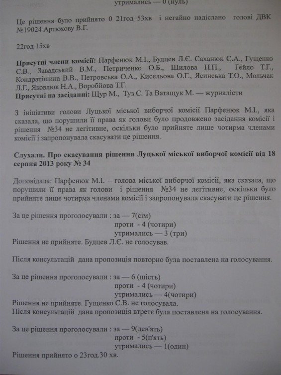 Таку детальну хронологію подій вдалось відтворити завдяки тексту протоколу №14 засідання Луцької міської виборчої комісії (на фото) та зі слів присутніх на засіданні журналістів.