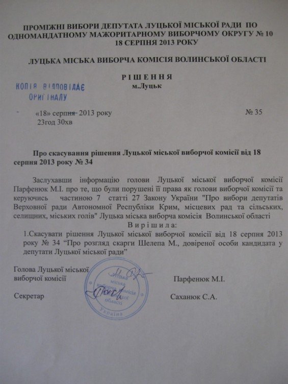 Попри чисельну перевагу прихильників Партії регіонів у міській виборчій комісії потрібне їй рішення вони змогли прийняти лише з третього разу. О 23:30 комісія більшістю голосів прийняла рішення №35 (на фото) яким скасувала рішення №34.