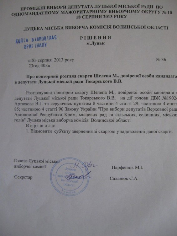 Скасувавши рішення №34, міська виборча комісія розпочала повторний розгляд моєї скарги. На цей раз проінструктована кимось комісія відмовила мені у задоволенні скарги – рішення №36 (на фото).