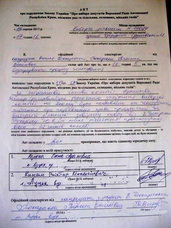 Таким чином мало місце грубе порушення закону, адже під час процесу голосування на виборчій дільниці дільнична виборча комісія не має права проводити своє засідання та приймати будь-які рішення. Тобто, ініційований головою ДВК розгляд питання про позбавлення права присутності довіреної особи був протиправним. Про це офіційним спостерігачем було складено акт про порушення закону про вибори. (на фото)