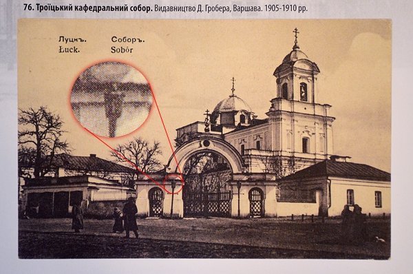 Ліхтарі біля входу в собор. Фото з книги «Луцьк у старовинній листівці, гравюрі та фотографії» Віктора Літевчука