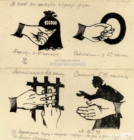 Антирадянський плакат ОУН. Напис: : «В СССР всі живуть з праці рук. Партія - з двох пальців, робітники - з трьох, інтелігенти - з чотирьох, селяни - з п'яти». З сайту istpravda.com.ua