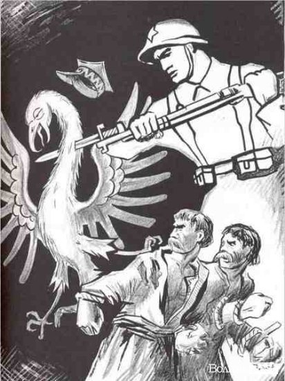 Радянський агітаційний плакат. Червоноармієць вбиває орла, що «символізує панську Польщу». Жовтень 1939 року