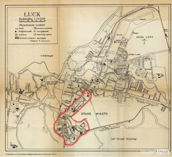 Орієнтовні межі Центральної виборчої округи у місті Луцьку під час виборів до Народних зборів Західної України. Карта з сайту lvivcenter.org