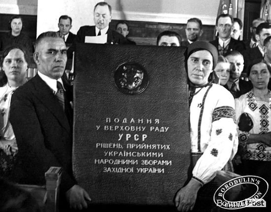 «Товариші! Ми 20 років були в ярмі польських панів та капіталістів. Вони нас пригнічували, мучили… Тепер ми вільні! Наша героїчна Робітничо-Селянська Червона Армія звільнила нас… Тепер у нас назавжди буде майоріти червоний прапор… я як депутат, обраний робітниками, висловлюю волю робітничого народу й голосую за те, щоб приєднати Західну Україну до квітучої Радянської України!».