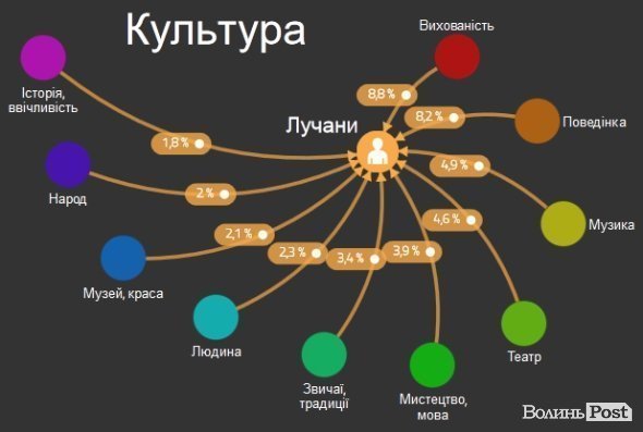 Найчастішими асоціаціями «культури» були вихованість – 8,8% від загальної кількості відповідей, поведінка – 8,2%, музика – 4,9 та інші, які позначені на діаграмі. Звідси видно, що більше всього, культуру мешканці асоціюють із добропорядним вихованням, а не власне культурою як свідомою діяльністю людини. Бо останнє – абстрактніше, хоча і всеохопне.