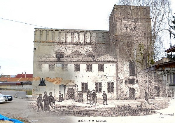 Синагога і євреї. На малюнку Діаментовського 1872 року зображена синагога і євреї біля неї. Такий вигляд вона мала до Другої світової війни – з двома прибудовами для школи і для жінок. Луцька синагога цікава своїм рідкісним оборонним типом. Під нею – підземелля, які, можливо, з’єднані з якимись іншими підземними спорудами. Про це писали дослідники минулого. Дехто вважає, що в підвалах споруди знаходилася міква – ритуальна лазня.