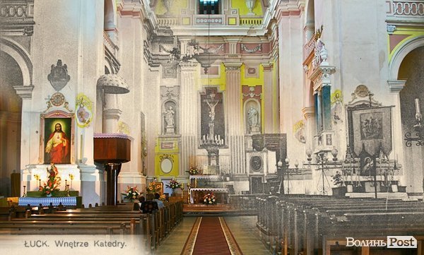 Коли в ХІХ столітті російська влада закривала костели, багато речей із них переносили сюди. На той момент це вже був кафедральний храм. Частину тих речей потім розікрали, але дещо залишилося. Це й старі полотна, різьблені дерев’яні меблі, скульптури, настінні герби, барельєфи, епітафії. Поштівка міжвоєнного часу.