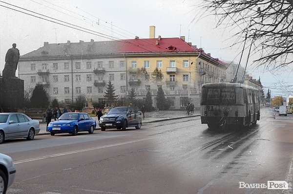 Пам’ятник Леніну. Найбільший пам’ятник Леніну в радянському Луцьку. Стояв напроти приміщення обкому Компартії, де зараз університет. Загалом їх в Луцьку було встановлено до десяти. Пам’ятник звалили під час буремних подій серпня 1991 року і стали збирати гроші на пам’ятник Кобзарю. Фото сімдесятих років.