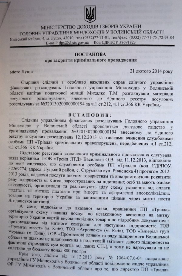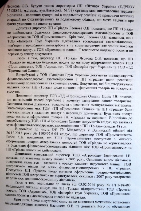 Слідчі Міндоходів у Волинській області стверджували, що мають заяву керівника ТзОВ «Трейд ЛТД» Василюка О.В. Заявник стверджував: службові особи ПП «Тріада» організували та реалізовують цілу схему ухилення від сплати податків та митних платежів, використовуючи кілька фірм, яким надають послуги. Йшлося навіть про конкретні фірми, нібо-то задіяні у схемі: «Промгазінвест», «Агролюкс», «Імперіал груп Україна» та «Промислові оливи».