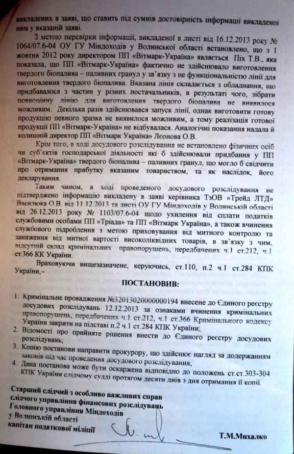 21 лютого старший слідчий з особливо важливих справ слідчого управління фінансових розслідувань ГУ Міндоходів в області капітан податкової міліції Тарас Михалко закрив це кримінальне провадження.