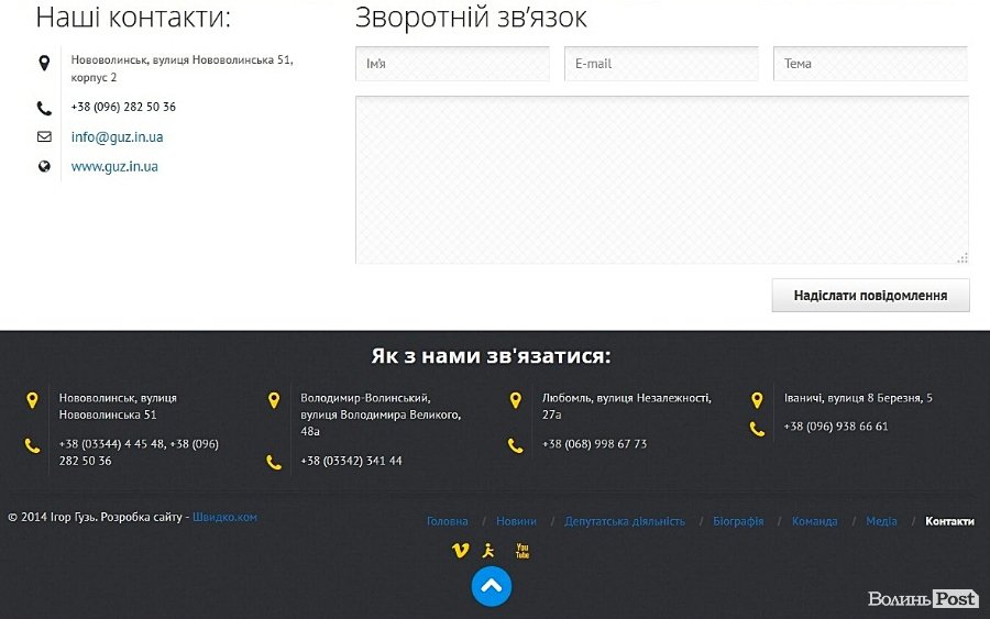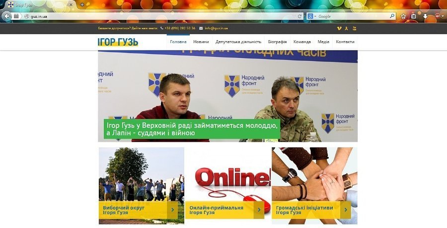 Ще донедавна персональний сайт нардепа Ігоря Гузя містив інформацію про нього, як про кандидата. Тепер же тут є онлайн-приймальня, адреси, куди можна звернутися за допомогою, та телефони. Графік прийому виборців відсутній.