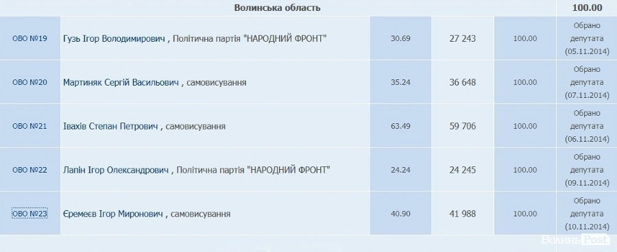 Про остаточні результати виборів у п’яти мажоритарних округах Волинської області стало відомо ще 10 листопада. Серед 62 кандадитів обрали п’ять депутатів до Верховної Ради України: троє парламентаріїв попередньої каденції (Сергій Мартиняк, Степан Івахів та Ігор Єремеєв) і два нових обличчя у Раді (Ігор Гузь та Ігор Лапін).