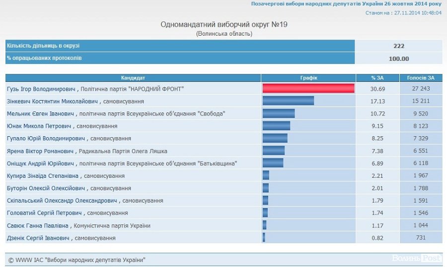 В окрузі № 19 (місто Володимир-Волинський) переміг Ігор Гузь, висунутий політичною партією «Народний Фронт». Його підтримали 27 тисяч 243 виборці. Натомість його основний суперник, самовисуванець Костянтин Зінкевич, отримав підтримку від 15 тисяч 211 виборців. Центральна виборча комісія затвердила Ігоря Гузя нардепом.