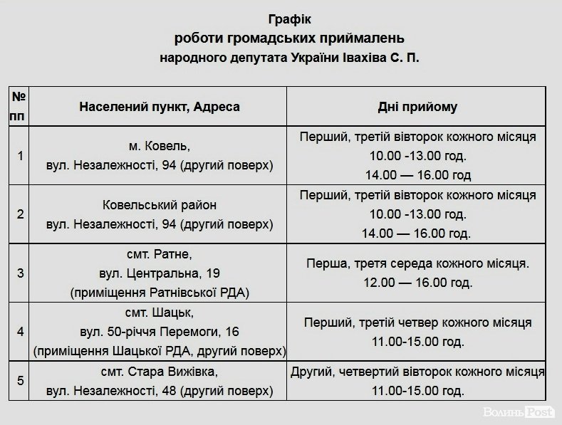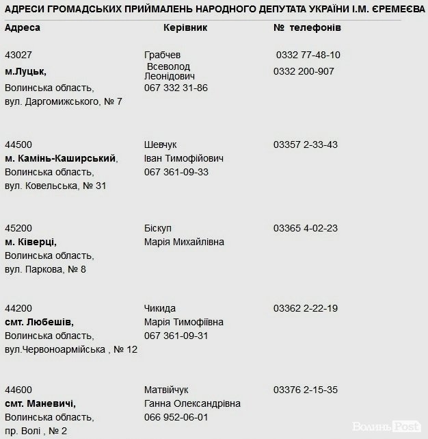 У тому ж розділі «Контактна інформація» вказані телефони, адреси громадських приймалень та їхніх керівників. Графіку прийому виборців немає.