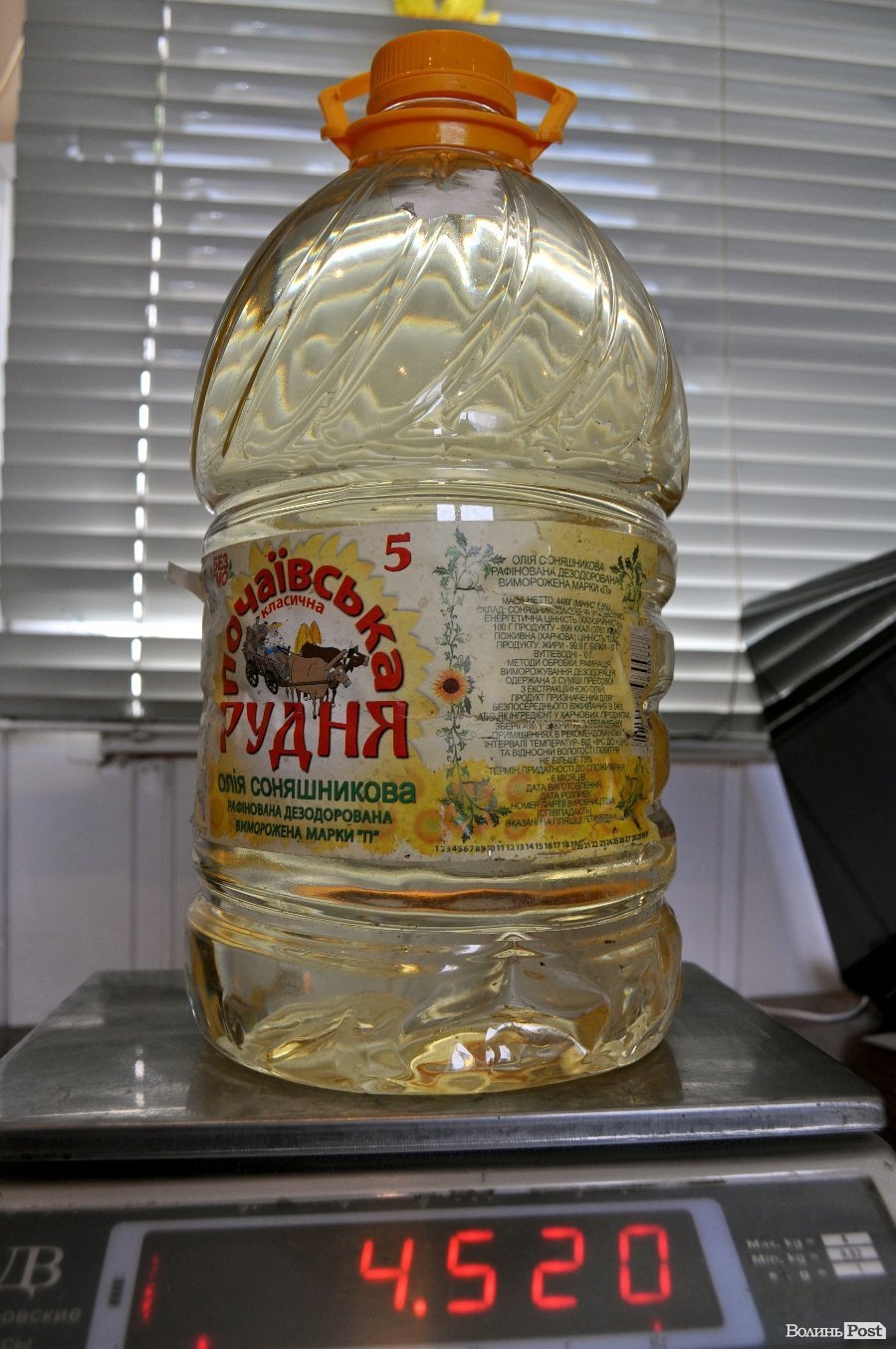 3. 5 л соняшникової олії важить 4600 г (маса нетто) мінус допустиме відхилення 1,5% додаємо тару орієнтовно 90 г. Виходить, що пляшка з олією 5 л мала б важити не менше 4621 г. На лицевій стороні етикетки торгової марки «Почаївська Рудня» нанесена така інформація: цифра 5 (без уточнення). Як бачите, пляшка важить лише 4520 г. Різниця – 101 г.