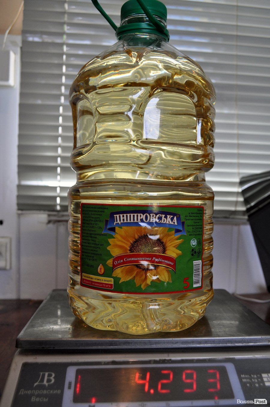 5. На лицевій стороні етикетки торгової марки «Рідне поле» нанесена інформація: 5 л. Як бачите, пляшка важить лише 4304 г. Різниця – 317 г.