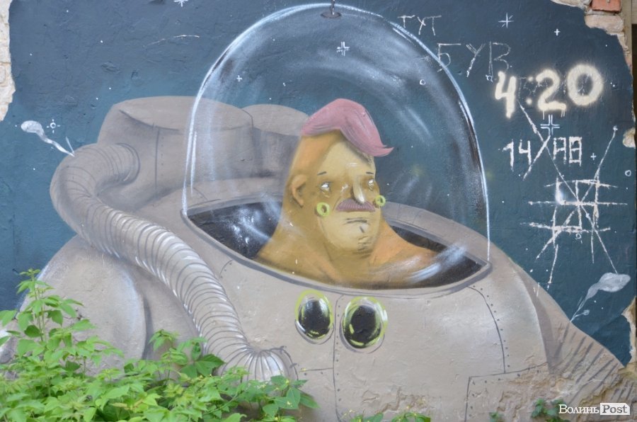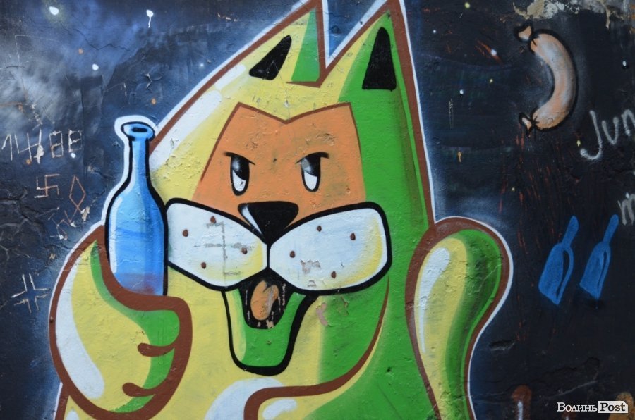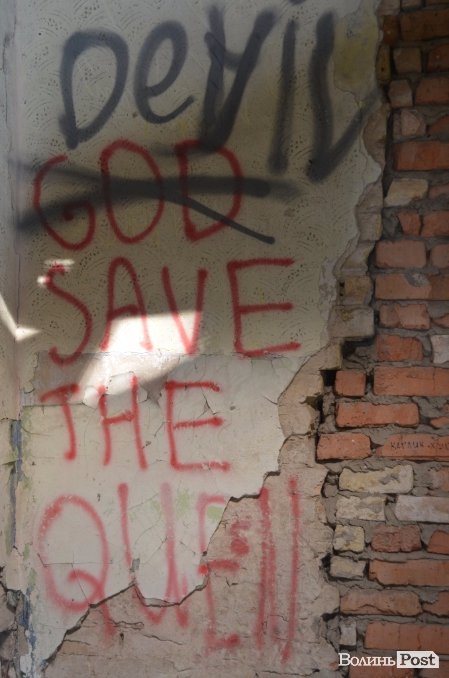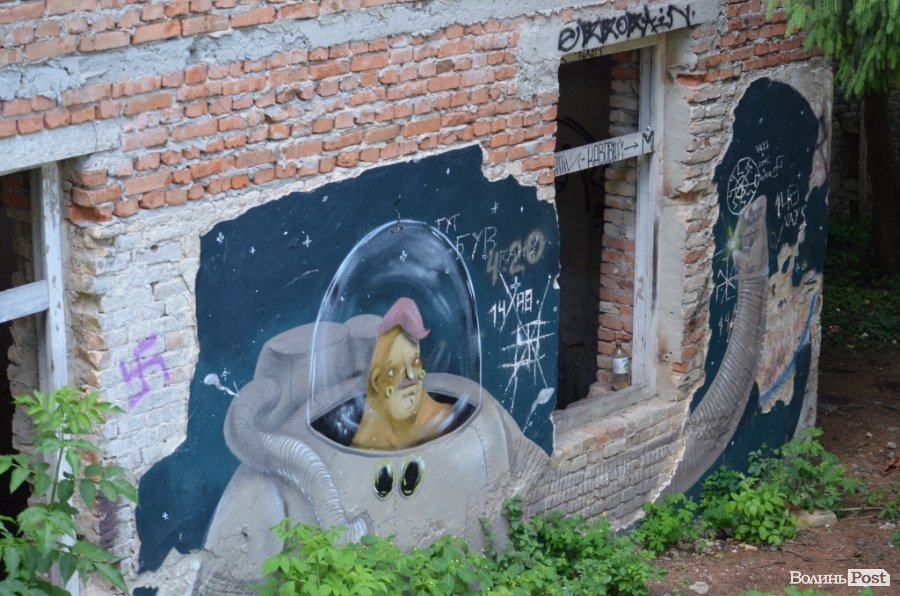 Після спуску в темряві далі йдеш по килиму зі сміття, аж ось і вихід – закритий кущами прохід у стіні. Подвір’я архітектурної споруди виявилось не таким страшним, як уявлялося. Де-не-де лежать порожні пляшки з-під пива та зім’яті пачки сигарет, але у більшості місць луцьких парків можна побачити і гірше видовище. Приємно вразили яскраві графіті на стінах дворика.