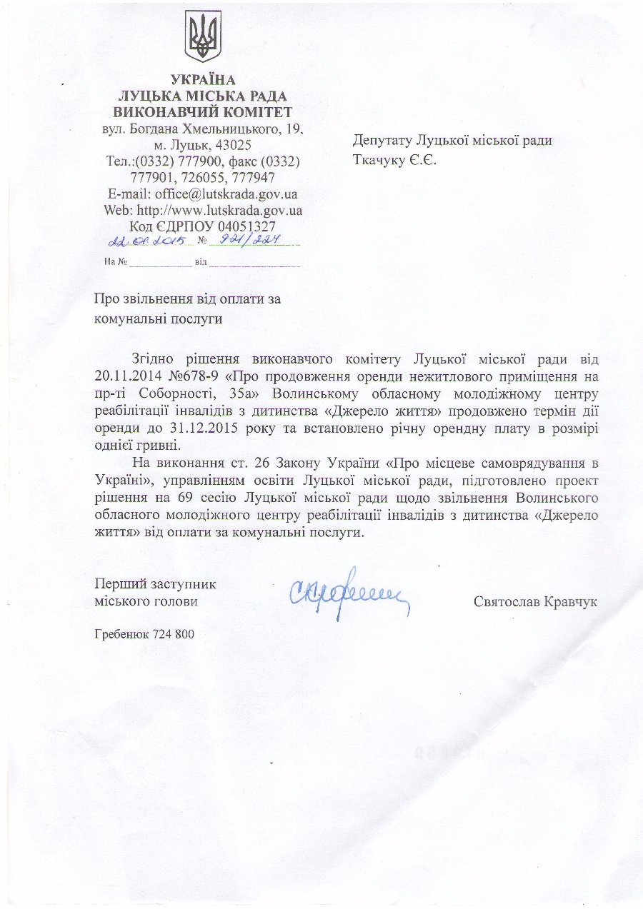 Натомість ситуацію роз'яснили і хворі діти лишилися в центрі, який знаходиться в дитячому садочку №20. Євген Ткачук разом з іншим депутатом Миколою Яручиком підготували запит, щоб орендна плата в рік дорівнювала гривні і домоглися, щоб вони не платили за комунальні послуги.