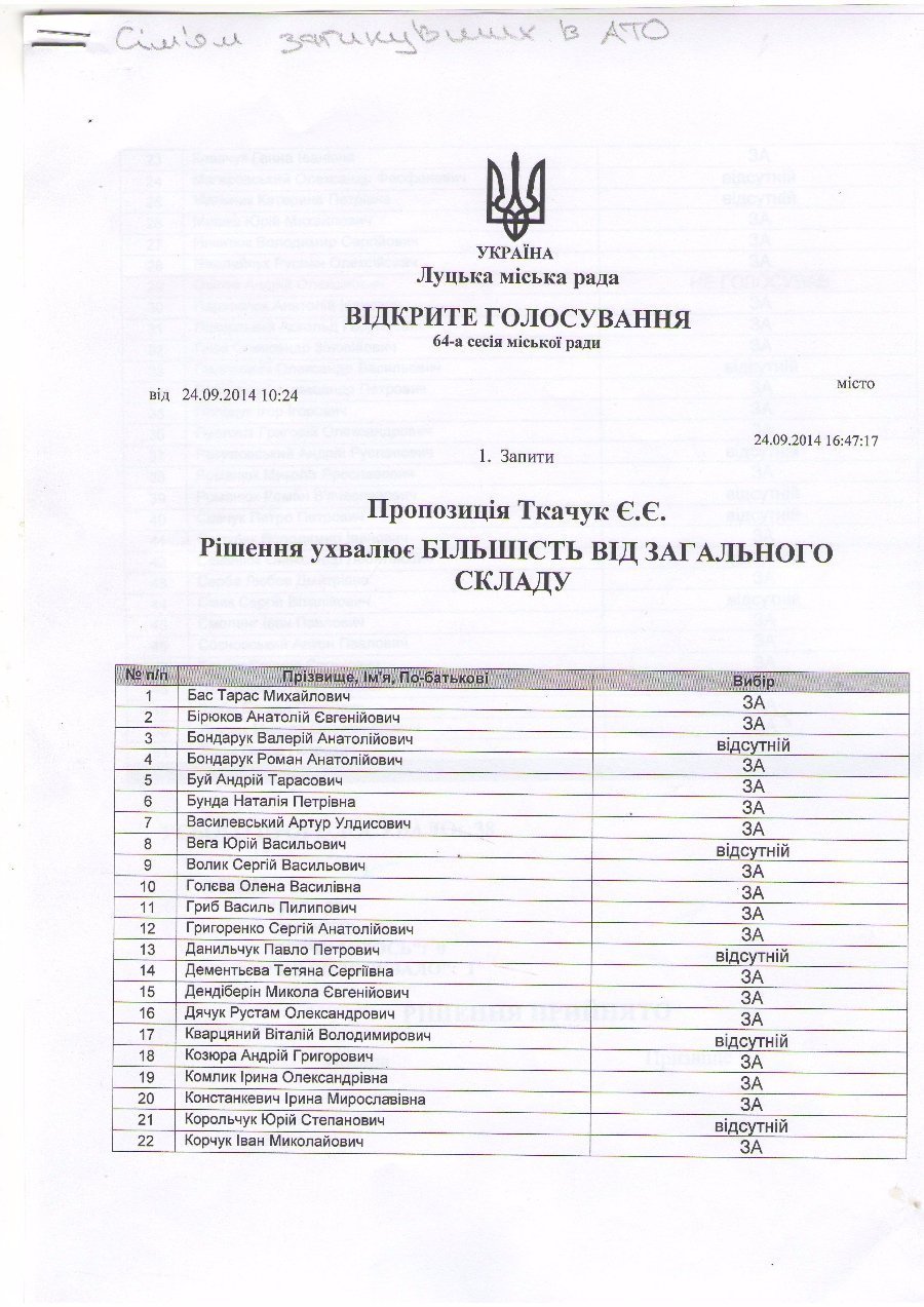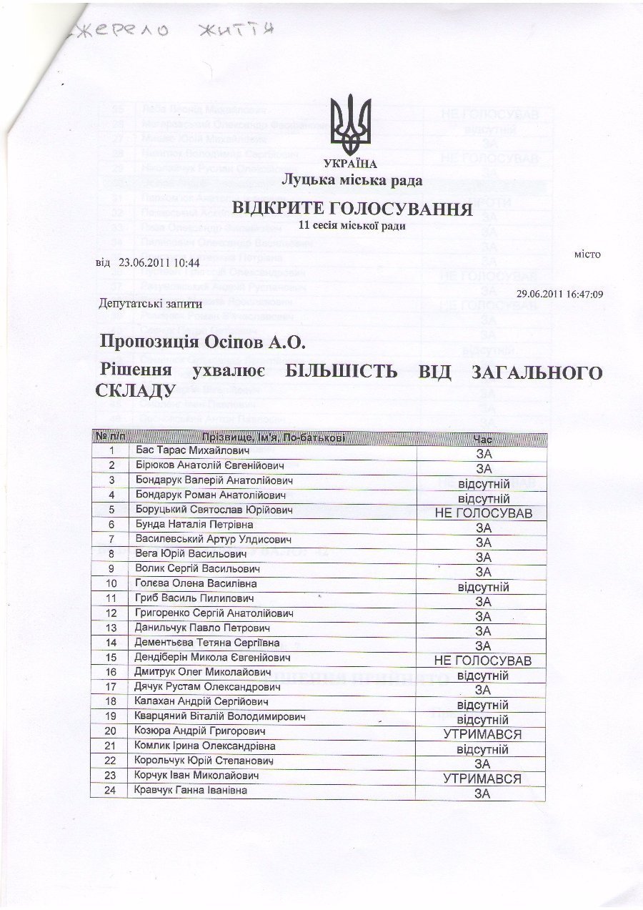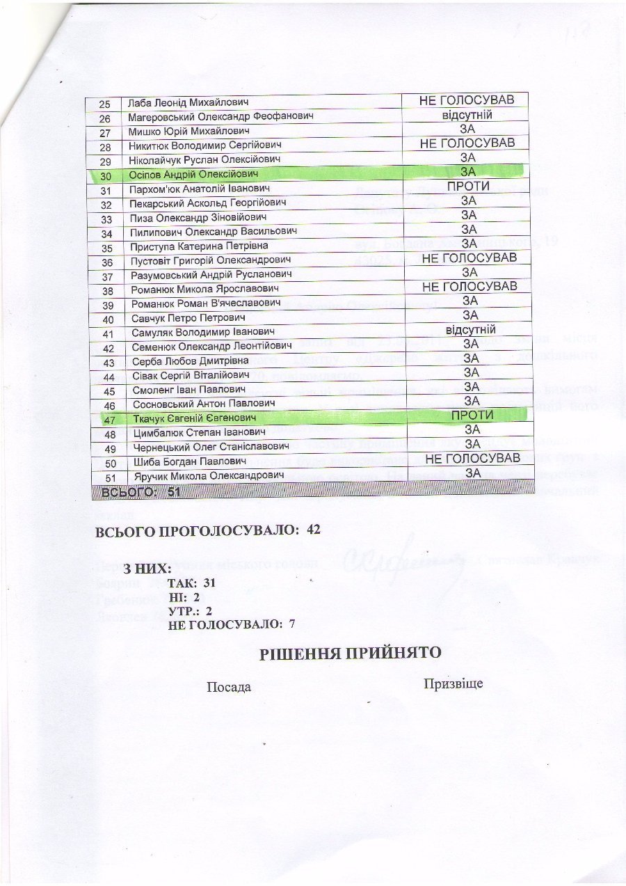 В свою чергу, Євген Ткачук проголосував «проти» депутатського запиту Андрія Осіпова щодо виселення молодіжного центру реабілітації інвалідів з дитинства «Джерело життя».