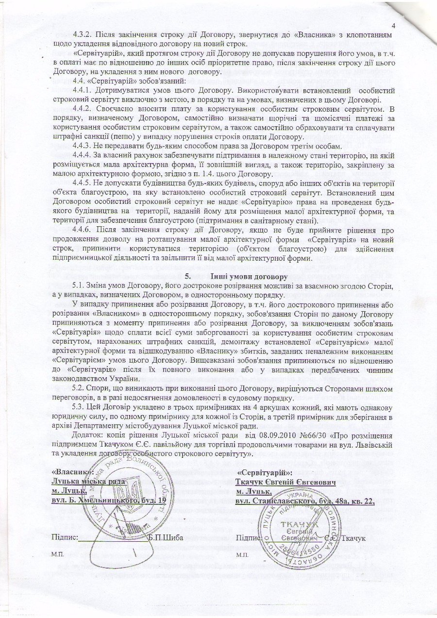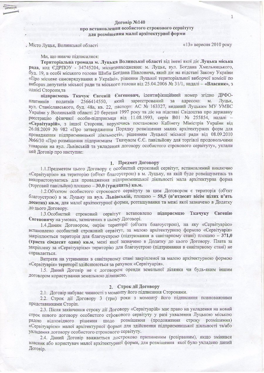 «Дозволи, які належать моїй родині, отримані ще 4 червня 2010 року на встановлення п’яти магазинів, до того як я став депутатом, а договір про встановлення особистого строкового сервітуту видані 13 вересня 2010 року», - пояснив Євген Ткачук.