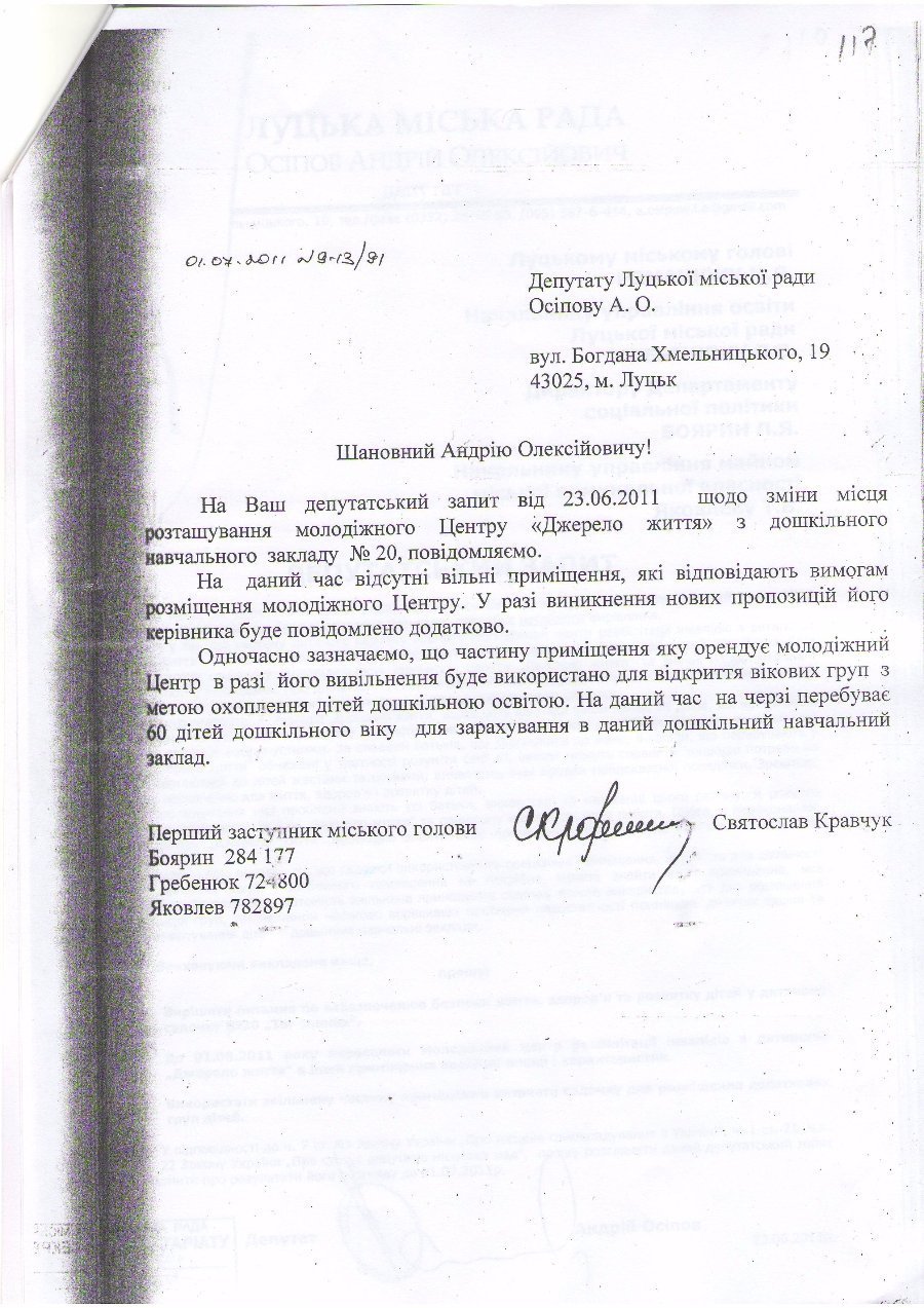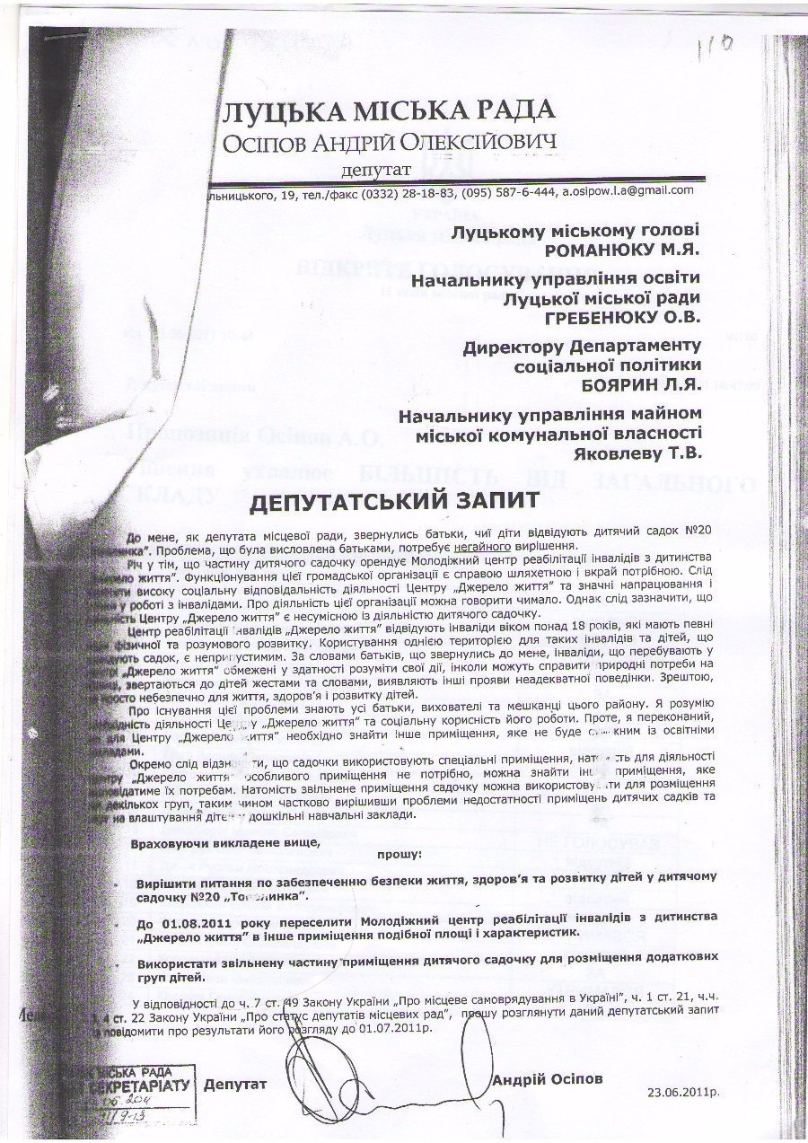 Своєю чергою, голова правління центру «Джерело життя» Людмила Зелінська розповіла нам про події, які були в 2011 році. В пік напружених стосунків між директором реабілітаційного центру та керівним складом садочка з’явився Осіпов, який вивчив ситуацію лише з точки зору дирекції садочка.