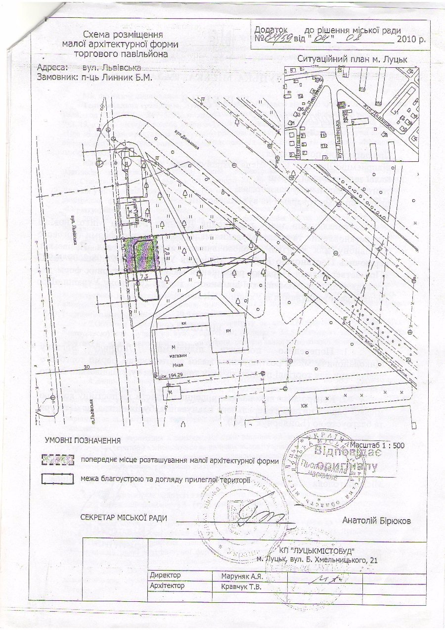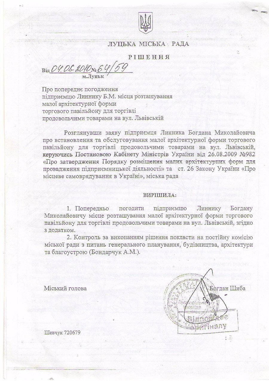 Начальник управління розвитку та підприємництва Луцької міської ради Олександр Козлюк підтвердив, що дійсно за цієї каденції дозвіл на розміщення магазинів та тимчасових споруд таким підприємцям, як Ткачуку Євгену Євгеновичу, Ткачуку Олександру Євгеновичу та Линнику Богдану Миколайовичу, не видавався.