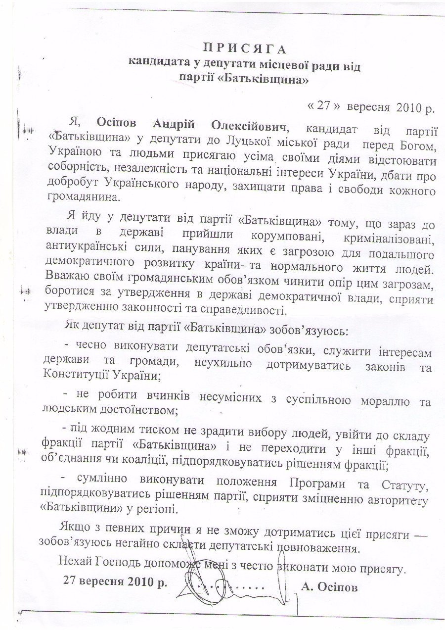 «Зобов’язуюсь чесно виконувати депутатські обов'язки, служити інтересам держави, не робити вчинків несумісних з суспільною мораллю та людським достоїнством, під жодним тиском не зрадити вибору людей, увійти до складу фракції «Батьківщина» і не переходити у інші фракції, якщо з певних причин я не зможу дотриматись цієї присяги – зобов’язуюсьсь негайно скласти депутатські повноваження»,- такі слова присяги зачитав кандидат у депутати Осіпов Андрій Олексійович 27 вересня 2010 року.