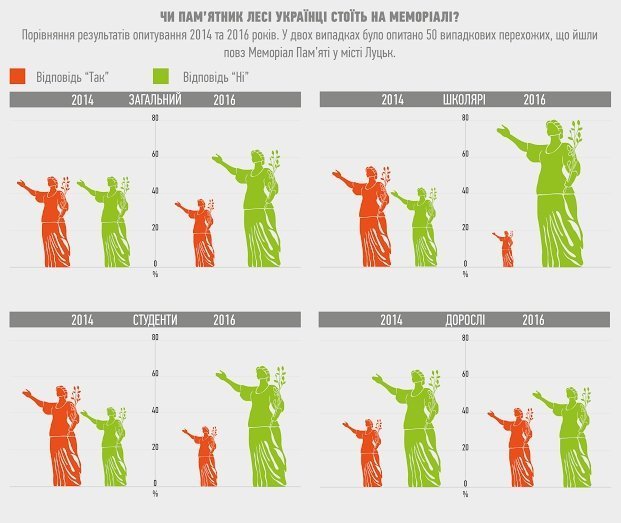 Мені не вкладалося в голові, що хтось може вважати, що на меморіалі знаходиться пам'ятник Лесі Українці, тому я вирішив зробити опитування у 2014 році. Став під стелою і запитував у перехожих чи це пам'ятник поетесі. На жаль, і на мій великий подив, за 50 опитаних половина відповіла "Так".
