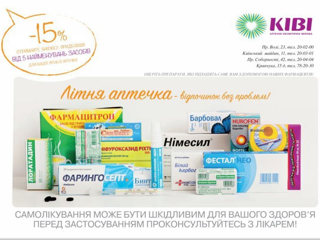 Але, комплектуючи дорожню аптечку, зверніть увагу й на препарати від найпоширеніших літніх недуг: харчове отруєння, проблеми з серцем, тиском, сонячні опіки та ін. Рекомендуємо обов’язковий мінімум для літнього запасу ліків.