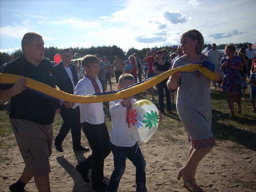 – Я не раз чув, що на березі цього прекрасного озера вже кілька років поспіль відбуваються перегони на байдарках, – сказав парламентар, звертаючись до присутніх. – Оскільки «Батьківщина молода» Волині є співорганізатором цього заходу, запропонував розгорнути тут національний стяг, який виготовила наша молодіжна організація. Він занесений до Книги рекордів України, бо є найбільшим у світі. Його площа – 2400 квадратних метрів!